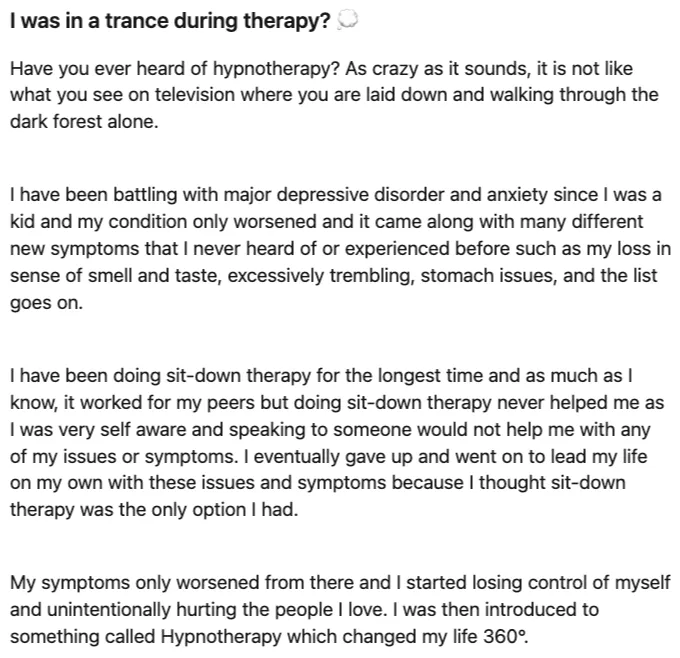 Let my clients reveal how hypnotherapy helped them conquer their problems.