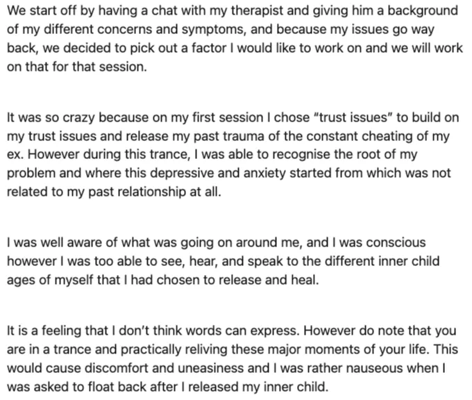 I haven’t felt this free and calm in a long time and I am glad to be able to regain that. I still have to go back for a few more sessions and I am motivated to go back knowing how much this actually helped me!